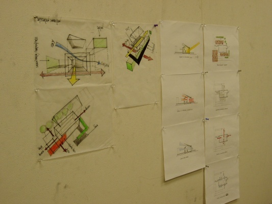 As it typical for the interaction of the courses, the team spent time together and time apart, discussing and then pursuing various disciplinary agendas. Engineering Team mentors Tom Serra and Dan Vlacich, both alumni of the 2005 Maryland Solar Decathlon, reviewed basic energy, power, and heat transfer equations with the engineering teams in order to further test the design of house systems. Architecture counterparts reviewed LEAFHouse summer research projects, in preparation for advancing the design and detailing of LEAFHouse components.