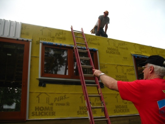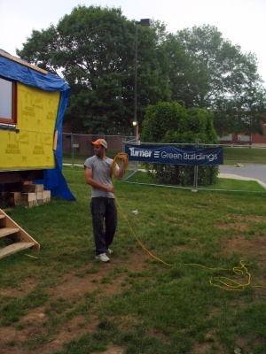 Today the Dean of the School of Architecture, Planning and Preservation, Garth Rockcastle, came out to the site to work alongside us. With the Dean's help the majority of the metal siding on the south side of the house was installed, and it looks gorgeous. To protect the interior of the house the blue tarp is currently covering the south wall and roof-- although the siding is not visible from the webcam, we've got pictures to prove it's there.