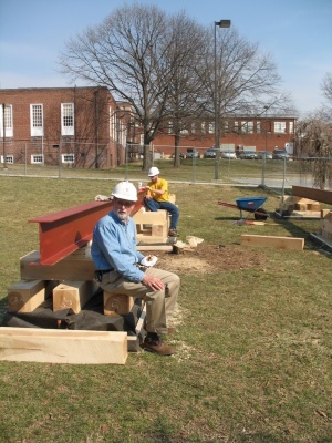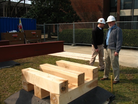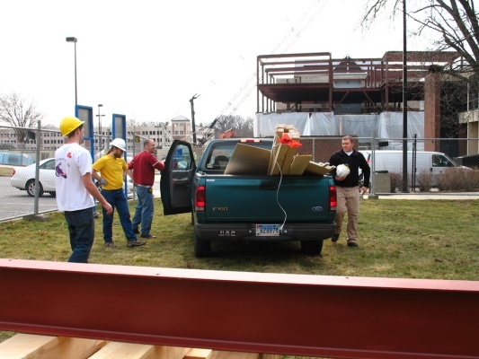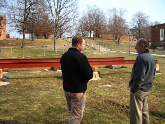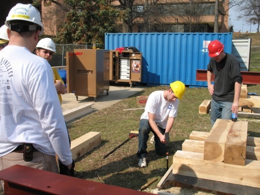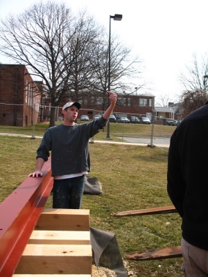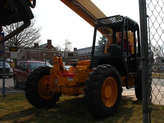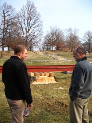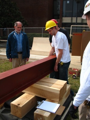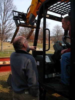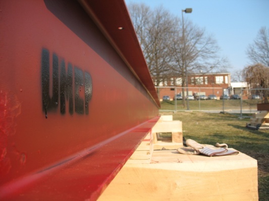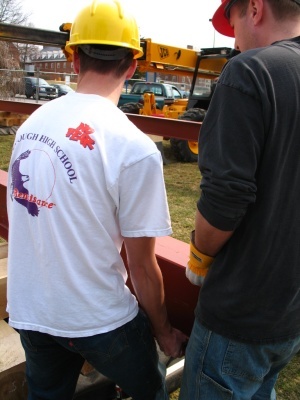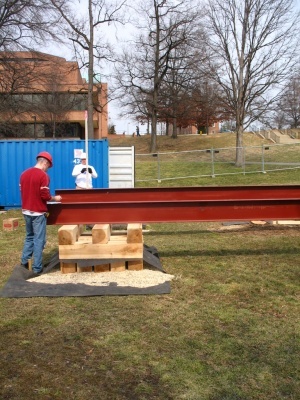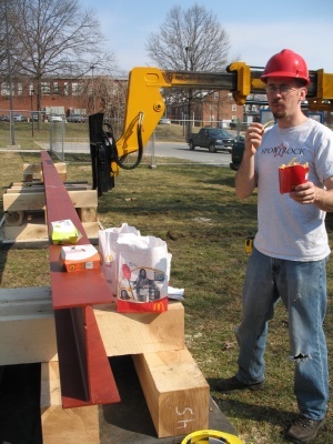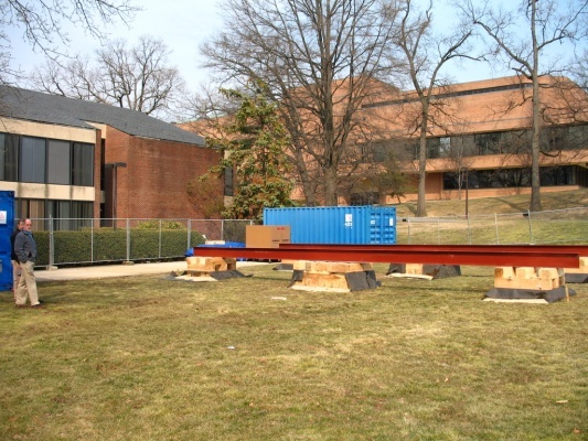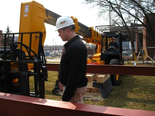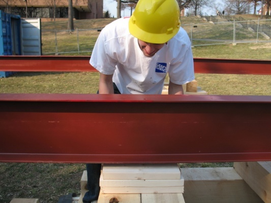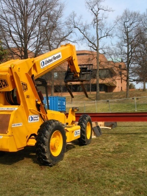 Steel finally arrived on the site. So did a nice toy from United Rentals. So, the LEAFHouse team worked Friday and Saturday to place and level the steel beams on the cribbing.