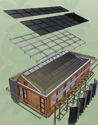 The racking grid that supports these collectors is like an industrial erector-set. This approach allows a flexible configuration of the grid. Homeowners can create arrays that are not only photovoltaic, but also photosynthetic, using the grid to its full solar potential with PV modules, or vegetation in planters similar to the green wall. The grid could also be left open, allowing for variety in the appearance of the soaring solar plane.