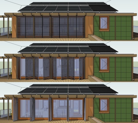 The south wall of the house is screened by louvered panels which pivot open and closed as desired. Like the roof, these panels can be customized, including additional solar collectors and vertical plantings.