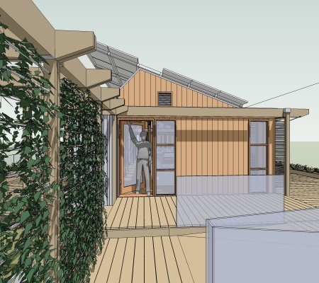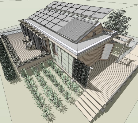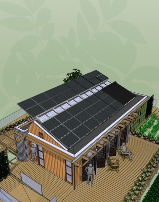 Skip navigation to main content.LEAFHouse is a holistic design. As with our model, the leaf, our house incorporates elements of water conservation, energy production, air transpiration, and simplicity and delight in form. But a leaf does not exist in isolation. It is part of an interdependent system. Likewise, our house must become a part of a system with the site on which it sits. A number of elements accomplish this, including decks, plantings, pergolas, and gardens. In its permanent home, we will further explore the integration of our prototype into the Chesapeake Bay watershed and climate. The final goal is an architecture that leads everyone to an abundant future through sustainable design.