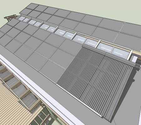 In the configuration we have chosen to display on the Mall, the grid extends beyond the ridge of the house while keeping the area above the skylight free of panels. This creates a dominant feature visible from the exterior and makes two rows of PV panels appear to float above the rest of roof.