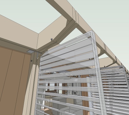 The south wall of the house is screened by louvered panels which pivot open and closed as desired. Like the roof, these panels can be customized, including additional solar collectors and vertical plantings.