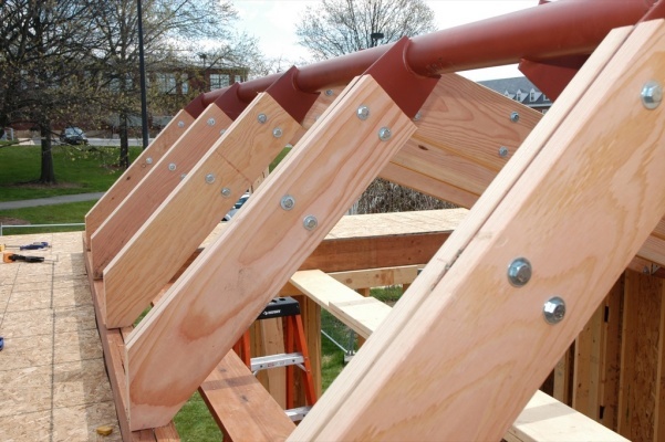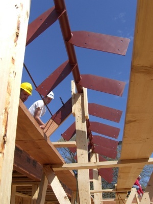 While the framing of the walls was driven by practical considerations, the framing of the roof required greater attention to the architectural expression envisioned by the team. In order to make the solar panel array integrate with the design of the house, we designed the volume of the living room to reflect the angle at which the panels would be mounted. The unique shape that resulted allowed us to enhance the expressive character of our structure, eventually leading to the use of the welded steel knife-plate and pipe beam depicted in these photos. When looking up in the house, can you see the stem and veins of a leaf?